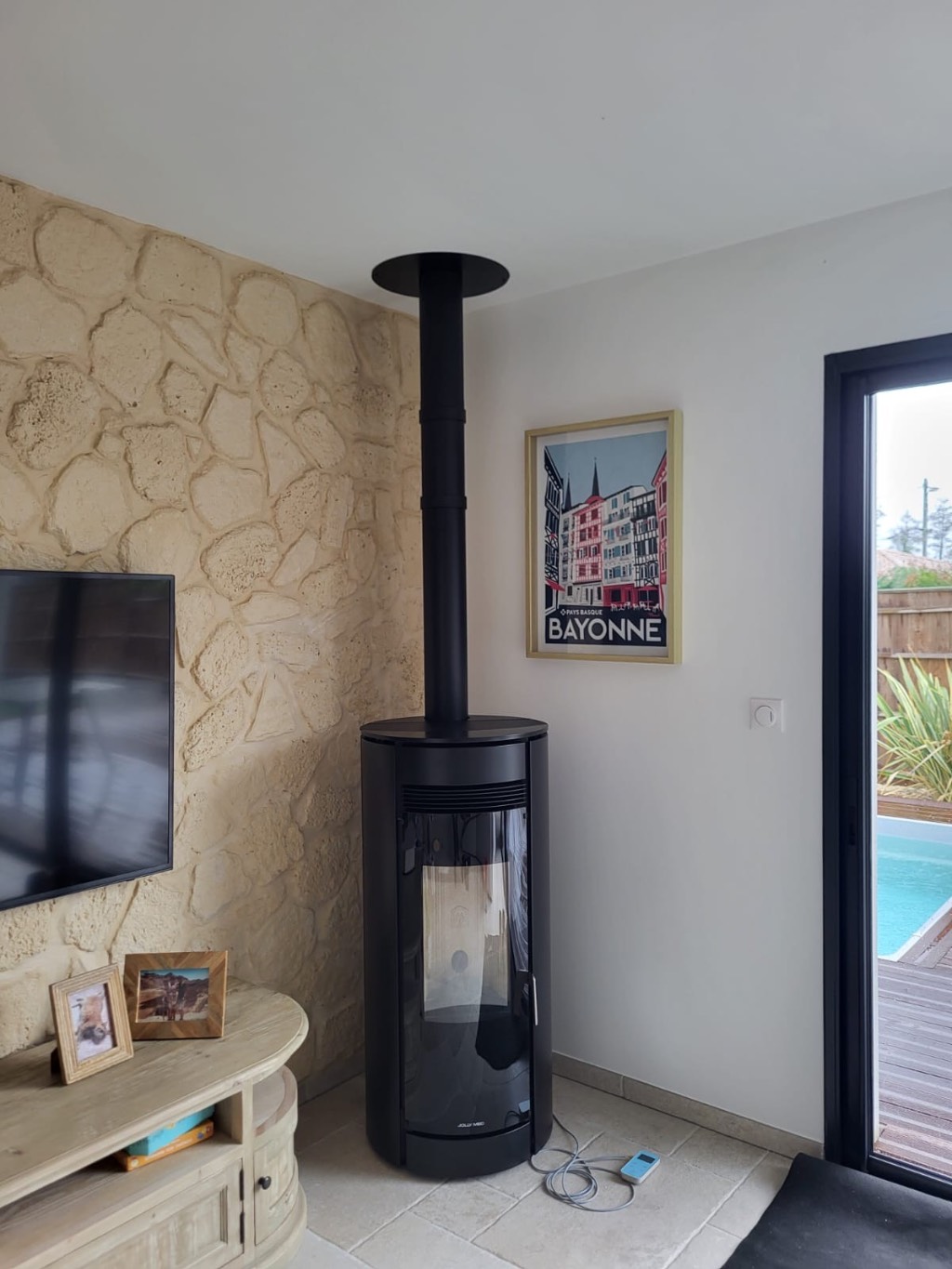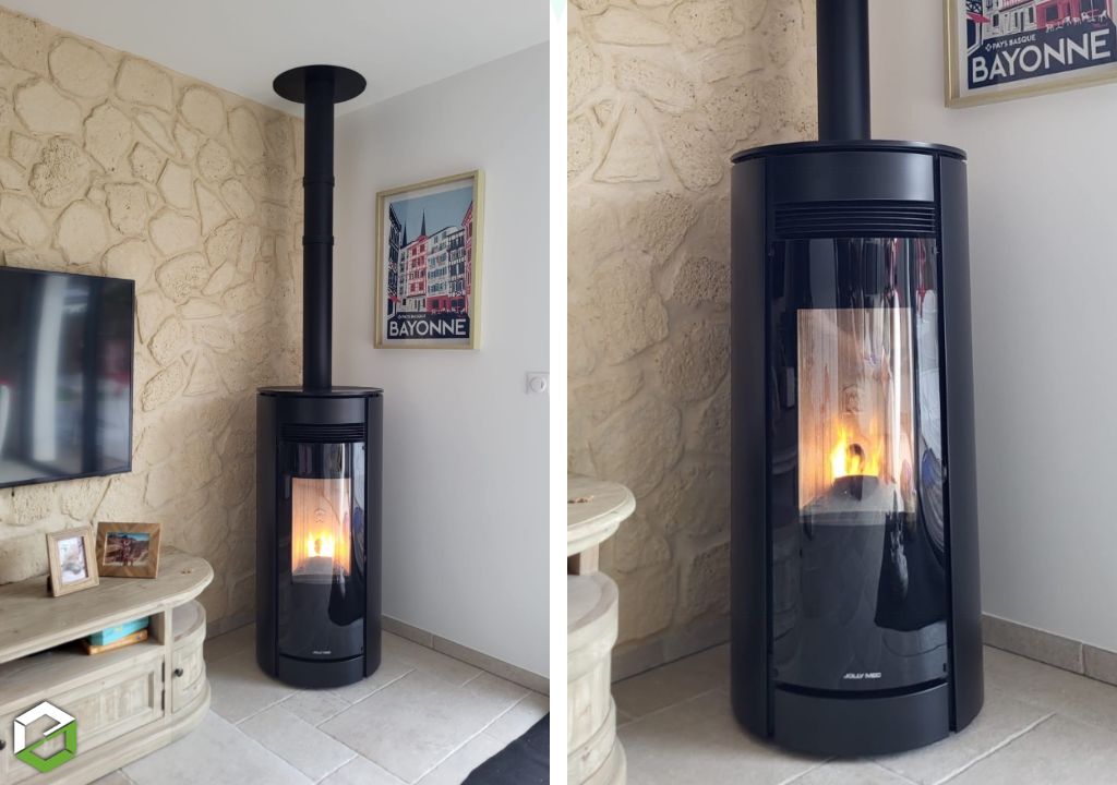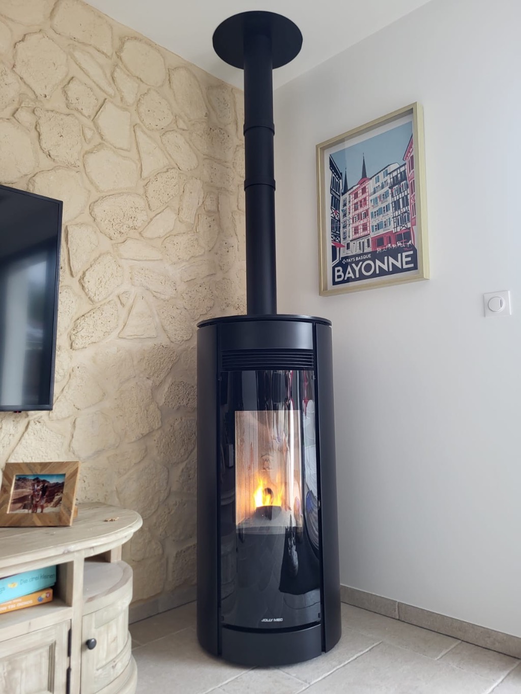 Nous avons donc installé un poêle à granulés Globo de chez Jolly Mec, un appareil qui s’impose comme une évidence dans ce type d’habitat :